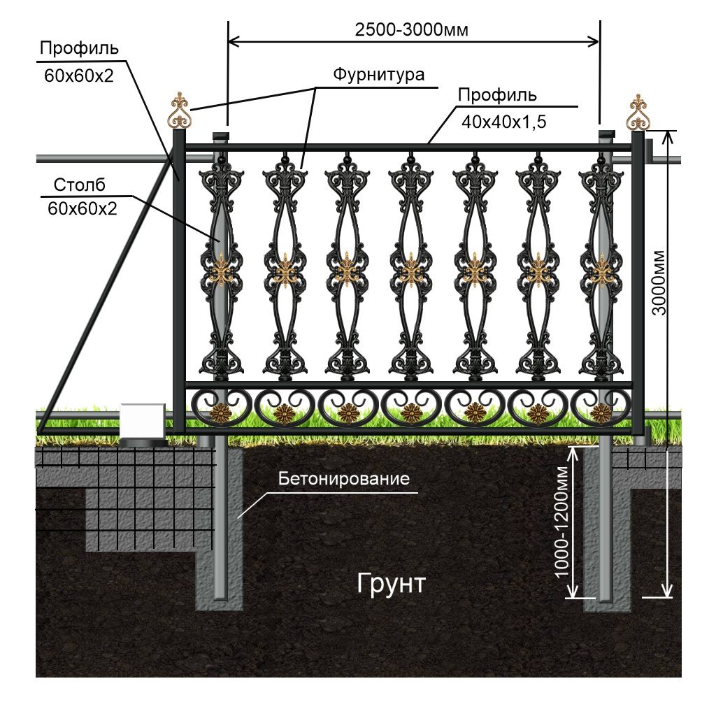 Конструкция кованого забора на ленточном фундаменте с кирпичными столбами: