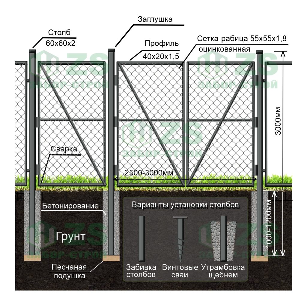 Конструкция забора из сетки рабицы в натяг: