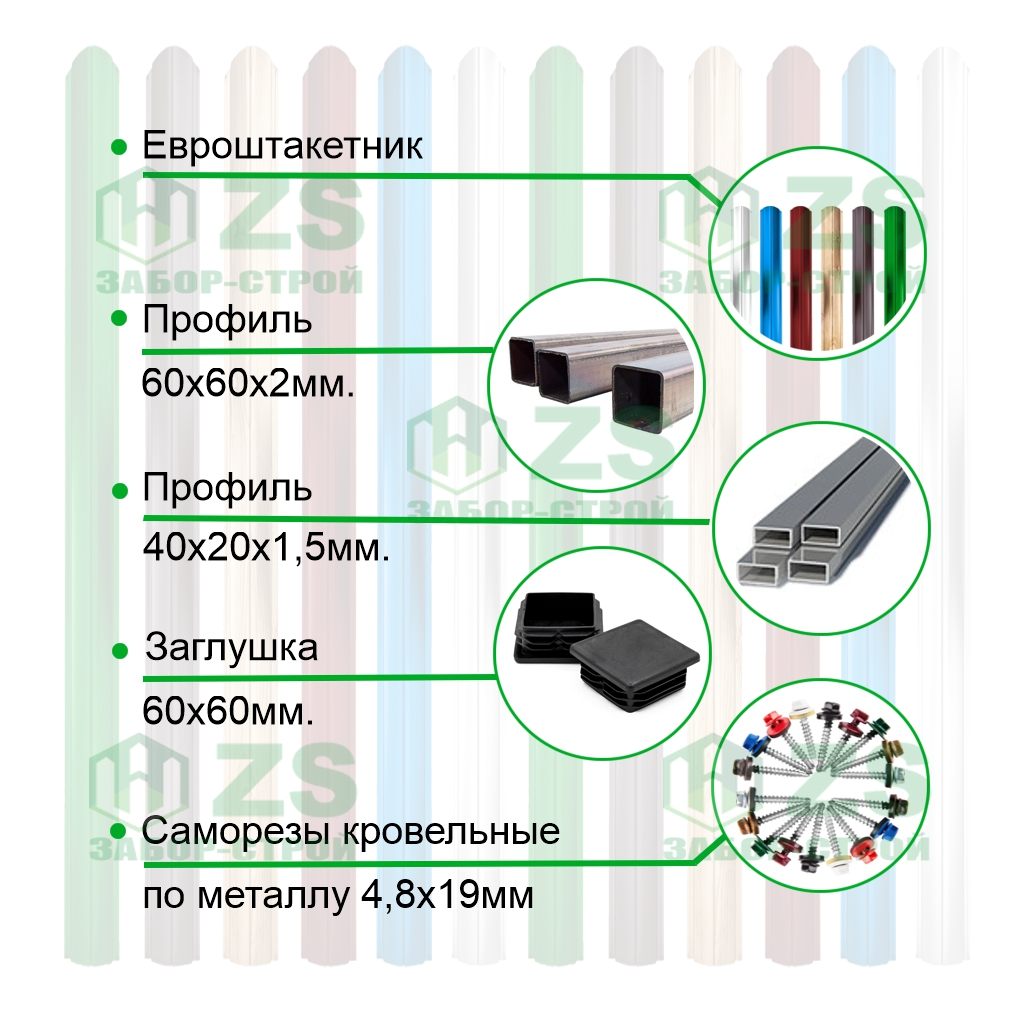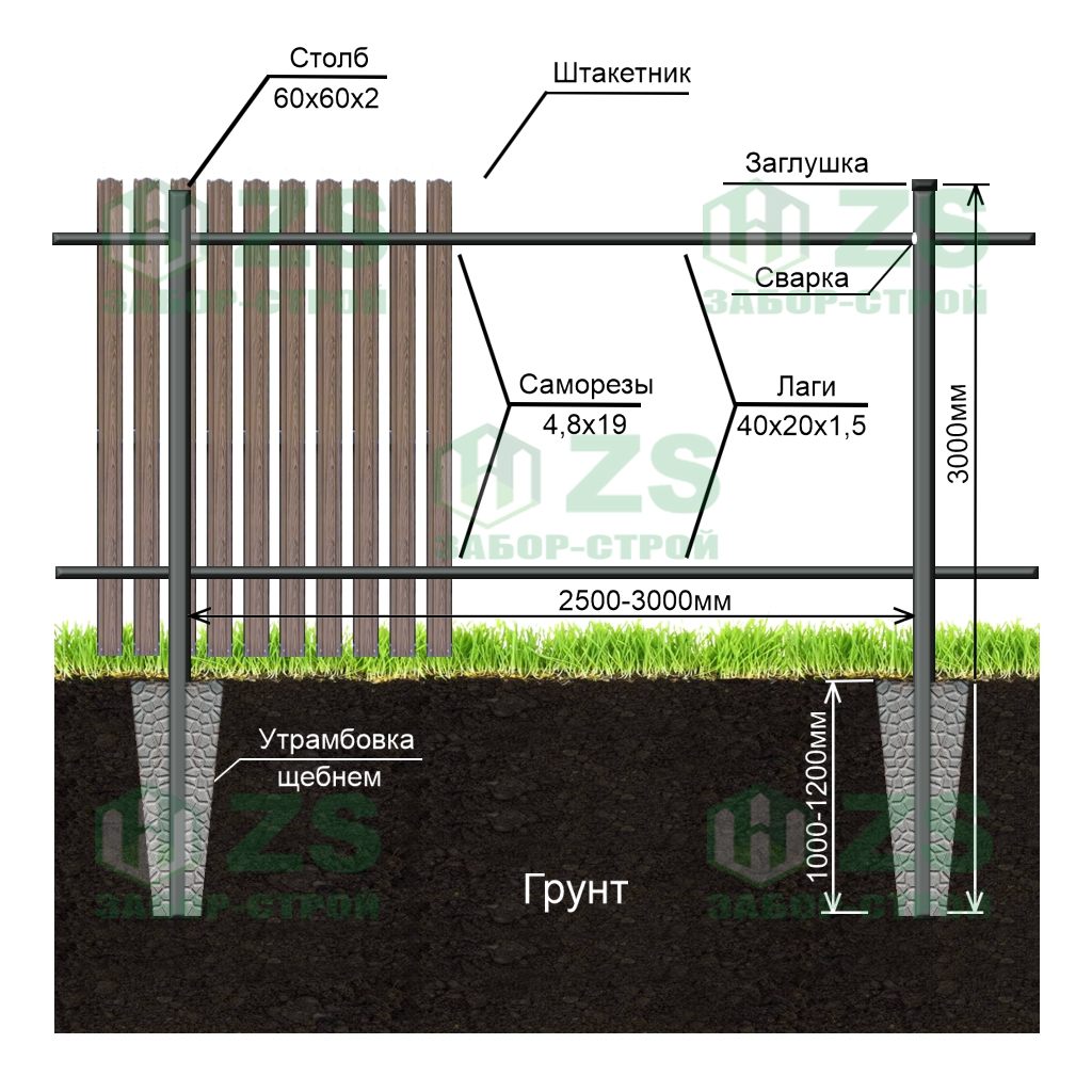 Конструкция забора из евроштакетника с бетонированием столбов: