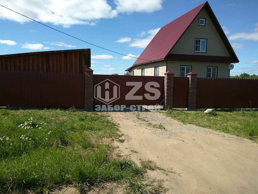 - Забор с кирпичными столбами из профнастила 25 метров
